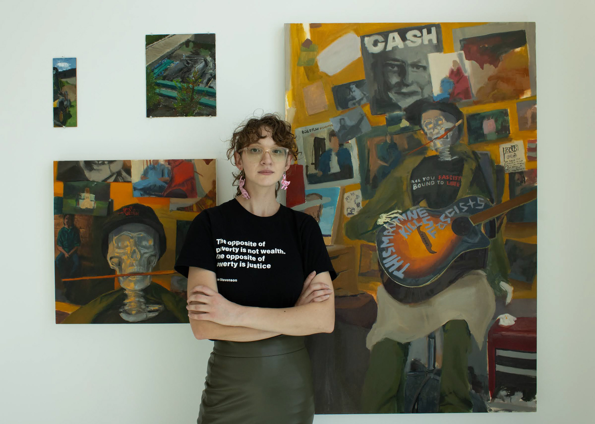 My paintings are for everyday people to feel seen, comforted, and reflective of their complicity in oppressive systems and ideologies. My paintings also make people benefiting from fascism uncomfortable and serve as a self-reminder of my civic duty to challenge systems that benefit me but harm my neighbors. When I paint, I listen to folk artists like Woody Guthrie who use art to speak on political issues. Woody once wrote in a journal entry, "I am a changer, a constant changer. I have to be or die. Because whatever stops changing is dead. And I am alive." As a painter, I am a grinder. A painting must have clarity of message to feel complete. I yearn for a death to complicity, where there is a future in which the world is better and I have nothing left to say. Till then, I must paint.